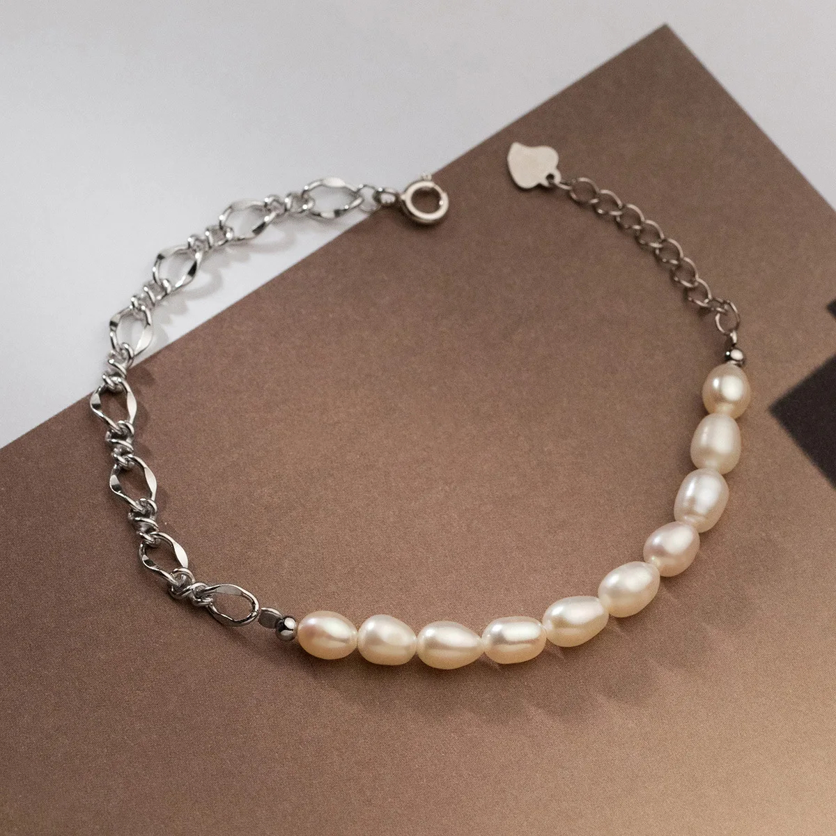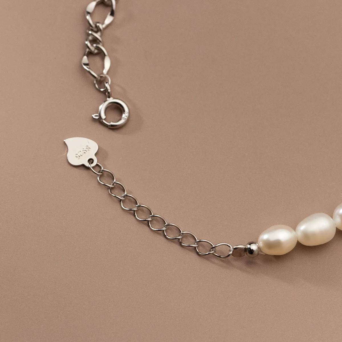 A contemporary 925 sterling silver bracelet featuring natural pearls and polished link chain—modern contrast with timeless elegance.