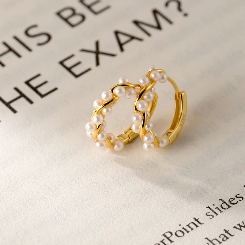 Sterling silver huggie hoops adorned with delicate pearls. A modern twist on classic elegance.