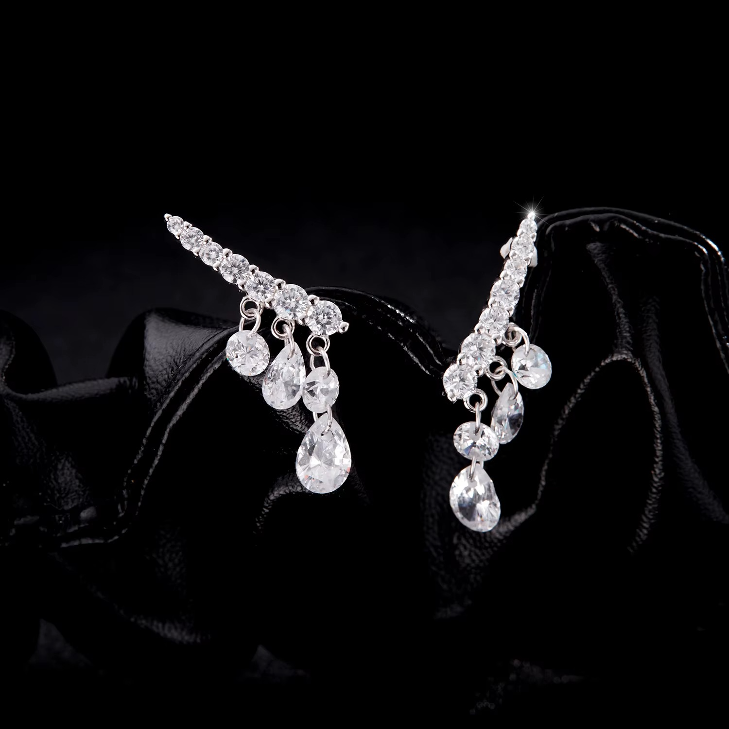 Turn heads with these stunning Zirconia Teardrop Climber Earrings, designed to elevate your look with maximum brilliance. Featuring a graceful ear-climber silhouette, each earring boasts three brilliant-cut zirconia drops—two round and one pear-shaped—hanging from a sleek line of pave-set stones.