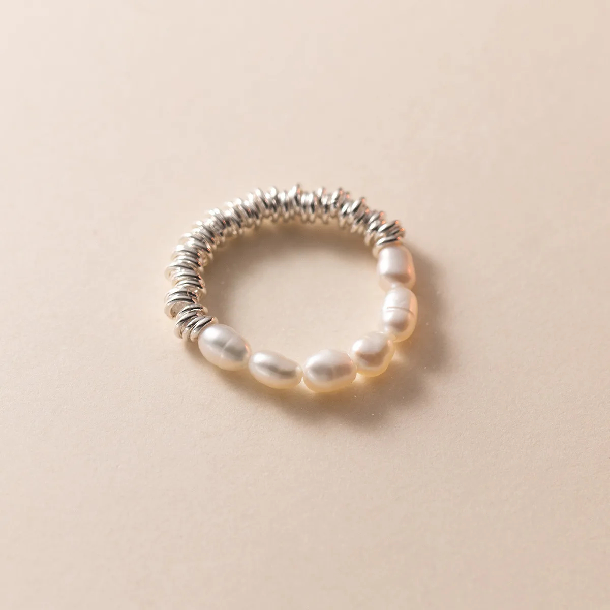 One half of the ring features organically shaped pearls, each with its own subtle character and soft glow. The other half is composed of textured silver bead detailing, creating a modern contrast in both form and finish.