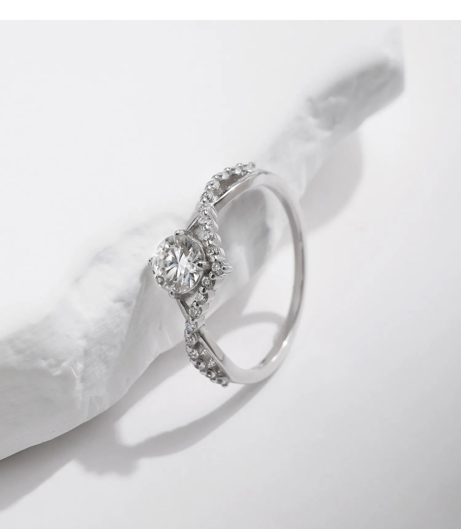 Brilliant, refined and timeless. The 0.50CT D Color Moissanite Crown Ring is crafted in 925 sterling silver and set with a dazzling round-cut moissanite center stone designed to capture light from every angle.